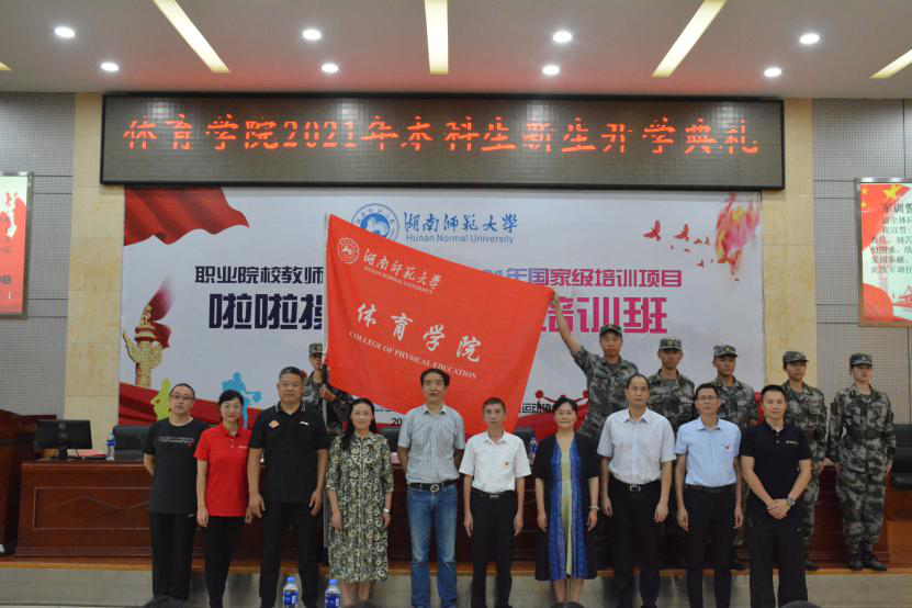 李明辉为体育学院2021级军训方阵授旗并合影留念。