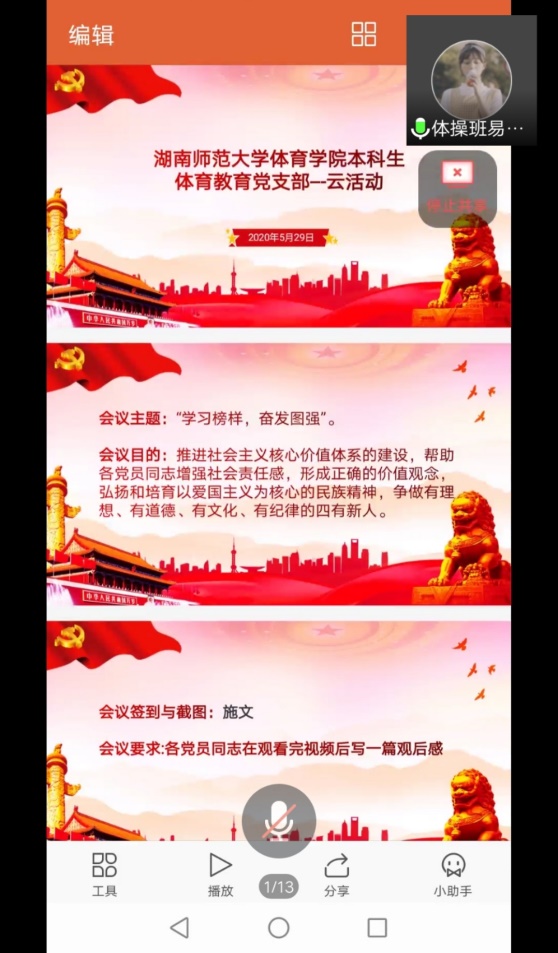 (通讯员 夏禹 杨金灵 杨卯)5月29日中午12点30,我院本科生体育教育党支部召开“学习榜样,奋发图强”主题云会议。会议由党支部书记夏禹老师、易雯婷同志主持,支部全体成员参与。