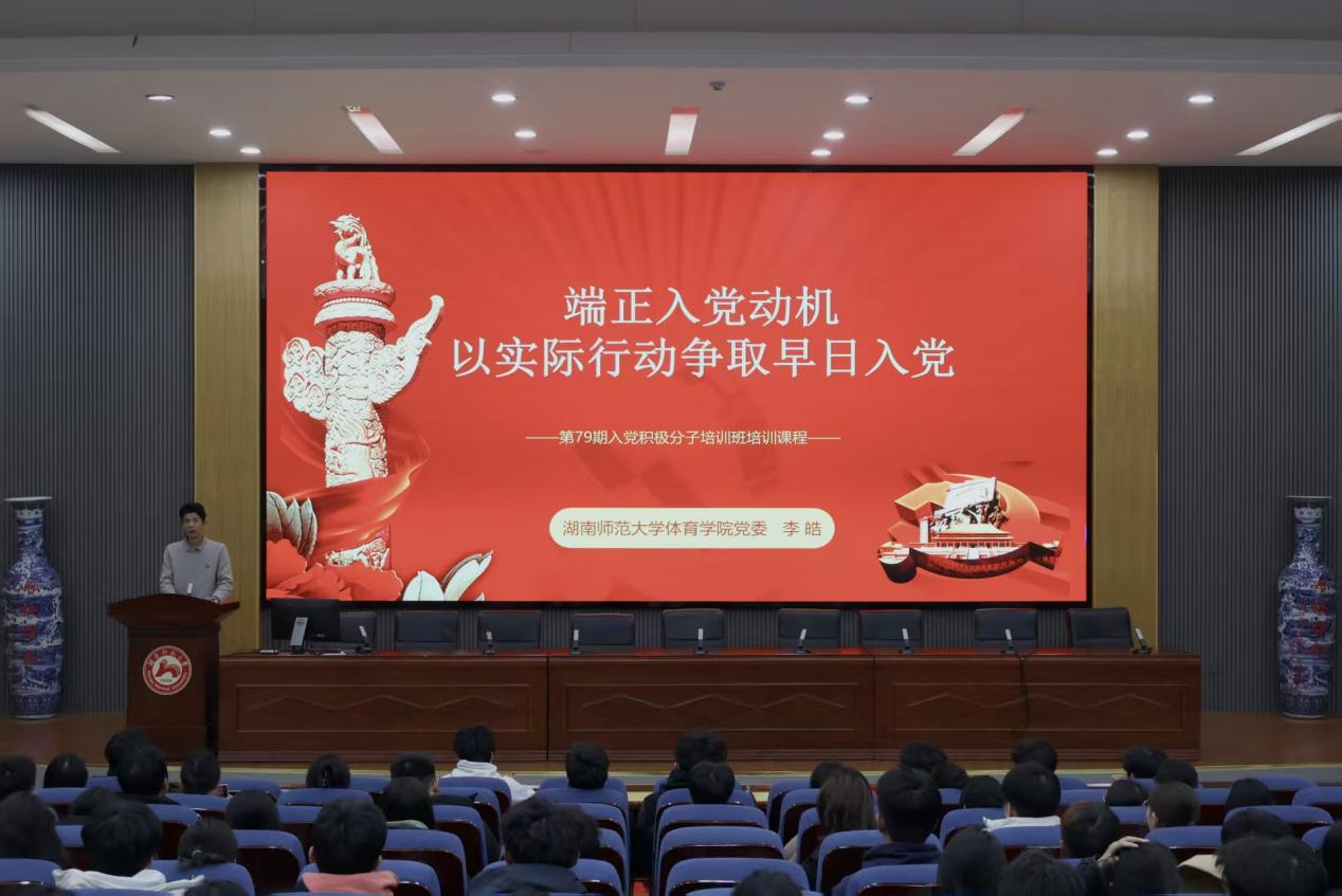 (通讯员:黄紫望)11月25日晚,体育学院第79期入党积极分子培训班开班仪式暨第一堂课在鸿建楼二楼阶梯教室举行,学院党委副书记李皓担任主讲人,全体入党积极分子学员参加培训。