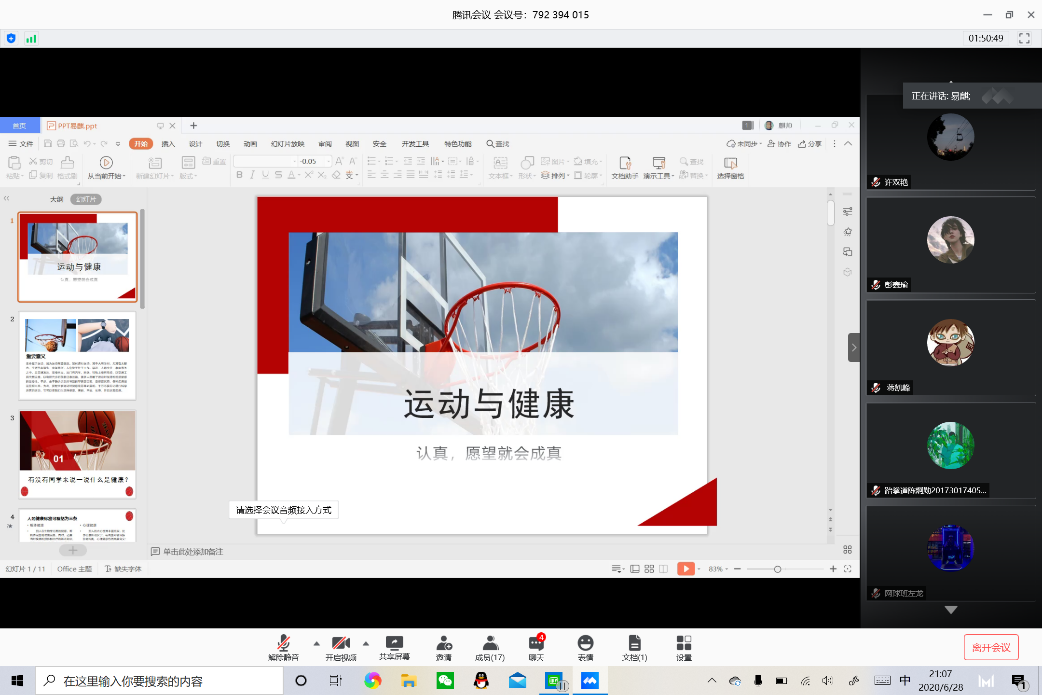 (通讯员 欧阳志宏)2020年6月29日晚19:30,体育学院2017级“曜熠凌云”实习队线上课件制作与说课考核在腾讯会议上如期举行。课件制作与说课考核的主体为“体育与健康”,评委老师为实习队指导老师匡梨飞和上官戎,十一队全队队员接受考核。