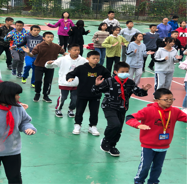 (通讯员 史润发 晏涵迎)11月3日,下午2:00师大附中高新实验中学初一年级开始学习本校自编的特色舞蹈,首先同学们在实习老师的指导下熟悉动作,之后骞翮二队队员吴玉兔在台上喊着口令示范动作,其他队员在旁协助,最后在队员们及学生的努力下,顺利完成本次课间活动,骞翮二队队员们通过本次大课间活动,队员们感受到了当老师的乐趣。