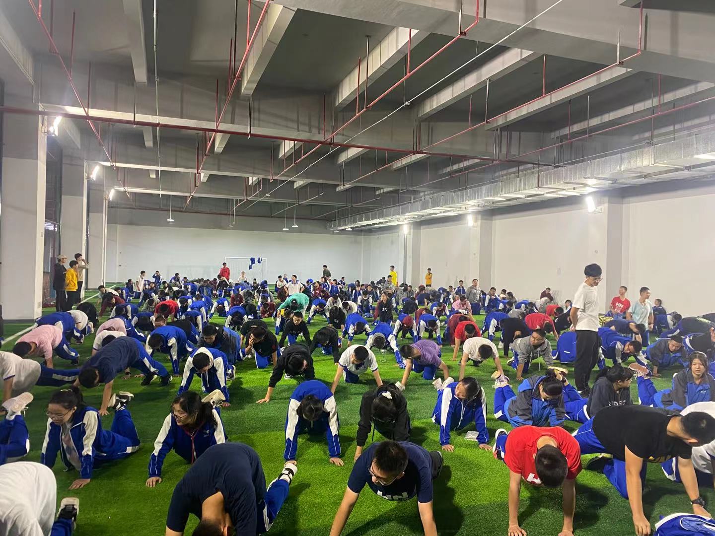 上午十点三十分,实习队全体成员在室内足球场协助指导高一年级学生体能操的学与练。附中体育教研组组长汤彬提出,在领操老师指导示范时,每个实习老师要主动深入队伍内部指导,让每个同学动起来并熟练掌握动作。