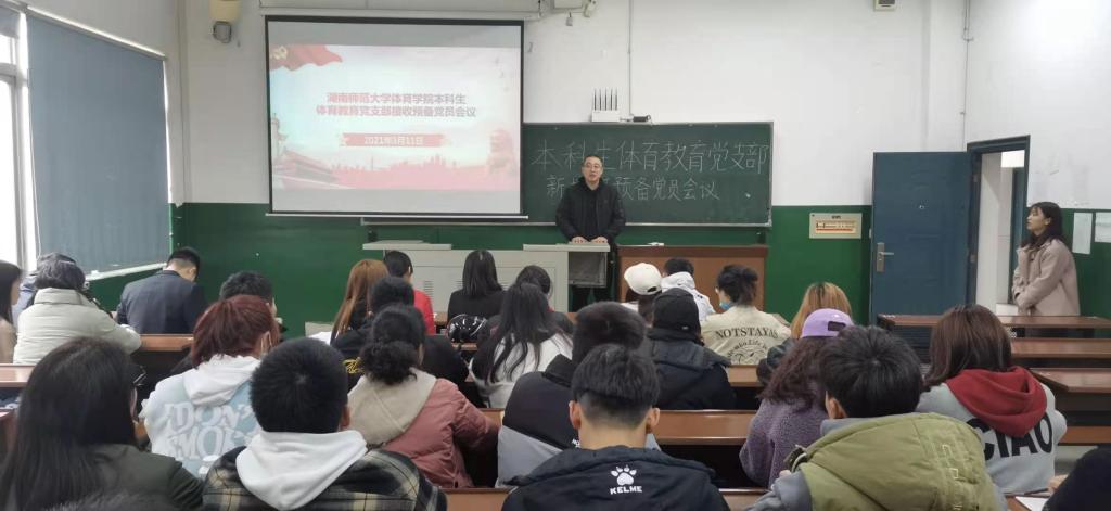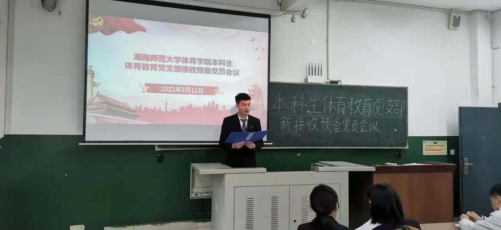 (通讯员 谢珊)3月11日中午11:40,我院在鸿健楼202教室召开体育教育党支部接收预备党员会议。党支部书记夏禹、2017、2018级体育教育党支部预备党员参加会议,其中拥有表决权的成员一共有15位,新接收预备党员一共有3位。本次会议由党支部副书记易雯婷主持。