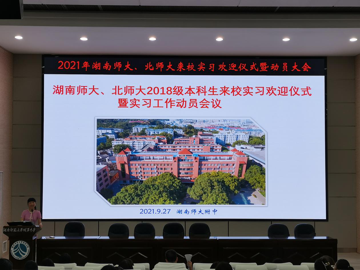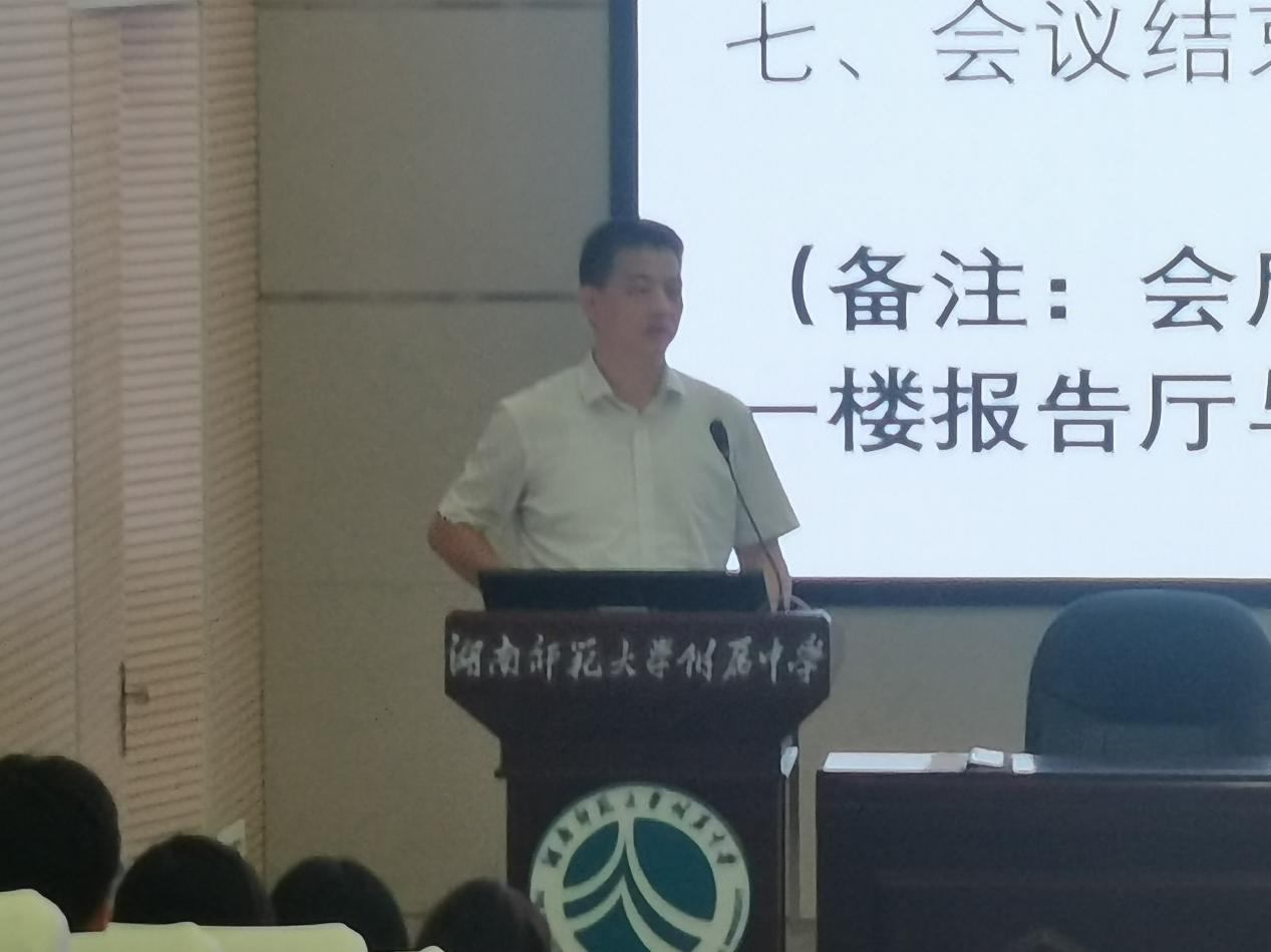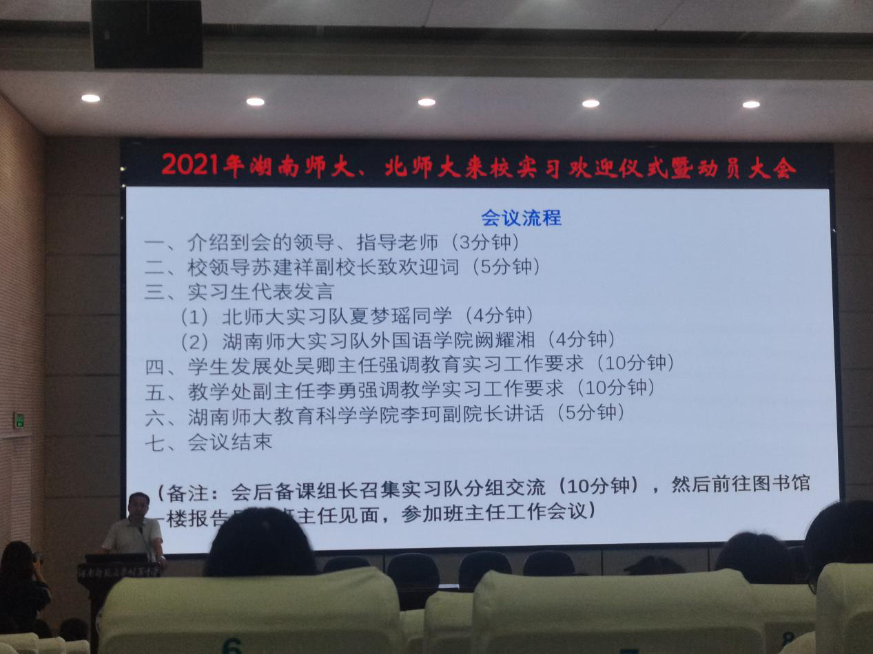 (通讯员 张伟毅 戴温雅)9月27日下午,湖南师大附中于其会议厅召开了湖南师大、北师大实习欢迎仪式暨动员大会。师大附中副校长苏建祥,学生发展处主任吴卿,实习七队指导老师匡黎飞、高一年级全体班主任,师大附中体育组组长汤彬出席本次会议,我校体育学院、外国语学院、生科院实习队全体队员参加本次会议。会议以副校长苏建祥发言拉开序幕。