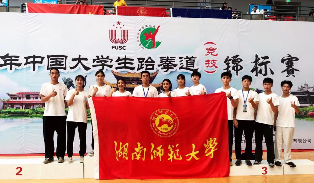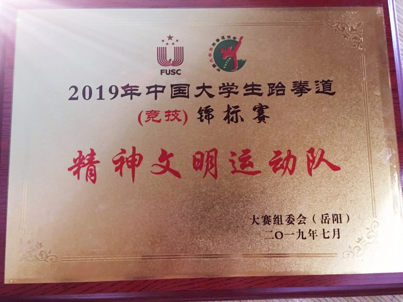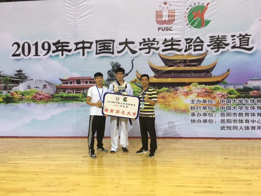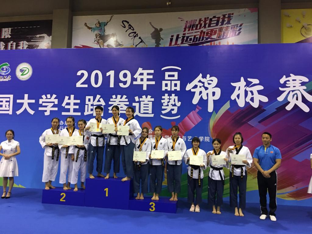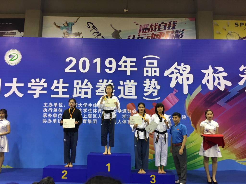 (通讯员 吴丹婷)2019年7月19日至24日,中国大学生跆拳道(竞技)锦标赛在湖南岳阳奥体中心举行。全国132所高校、共1300余名运动员参加,参赛人数创本赛事历史之最。随后,中国大学生跆拳道(品势)锦标赛于25日在浙江理工大学科技与艺术学院开幕,来自全国各地80多所高校、800余名运动员参加。我校跆拳道队由体育学院李波副书记担任领队,汪明华老师担任教练,队员们敢打敢拼、顽强拼搏,共取得一金一银三铜及三个第五名的好成绩。另外,代表队获得“精神文明运动队”称号,汪明华教练获得“优秀教练员”奖。
