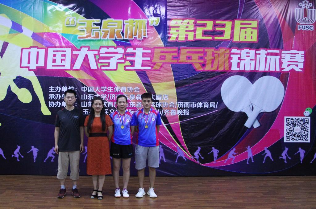 此次比赛我校共派出4名运动员参加6个项目的比赛,在女子双打比赛中,我校队员蒋慧、赵阁,顽强拼搏,力克强敌,获得冠军!冠军争夺战中,我校对阵吉林大学,我校运动员在大比分2比1领先,第四局7比3领先的情况下被对手追至8平,最后挺住压力,以11比8取得胜利,最终3比1战胜对手。