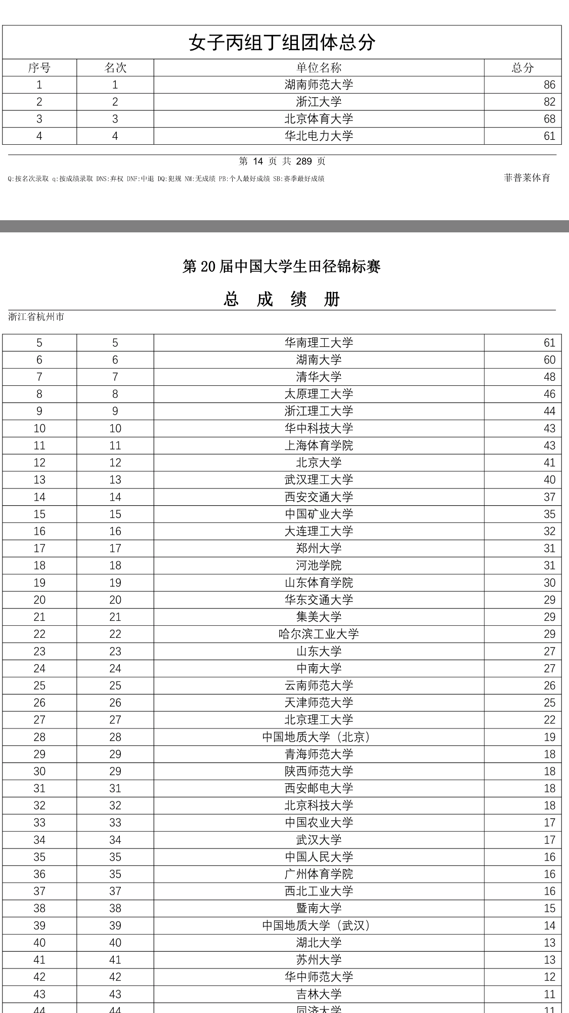 由中国大学生体育协会与中国田径协会主办的第20届中国大学生田径锦标赛于7月28日至8月5日在浙江大学举行,经过参赛运动员奋勇拼搏,我校斩获5枚奖牌,其中金牌3枚,银牌2枚,并荣获女子团体总分第一,团体总分第四的佳绩,并获得“体育道德风尚奖”称号。