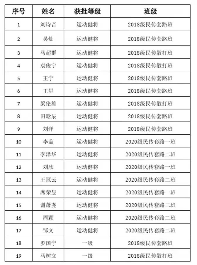 2021年11月9日收到中国龙狮运动协会下发关于《中国龙狮运动协会运动员技术等级管理办法(试行)》的通知,我校按照文件要求积极整理相关资料,加快推进舞龙舞狮运动员技术等级申报工作,在2018年—2021年相关赛事中,太阳网集团tcy8722龙狮团队共有32名同学荣获首批“龙狮运动员等级”称号,其中梁贤、马超群等30位同学获批“运动健将”称号,马树立等2位同学获批“一级运动员”称号。