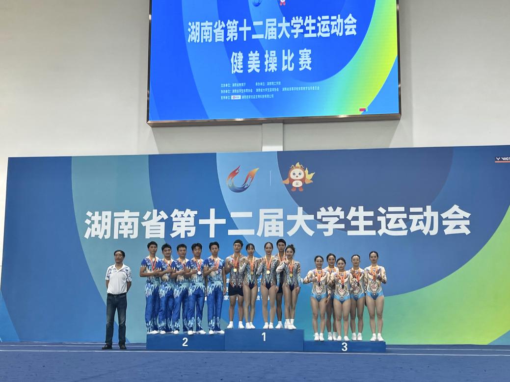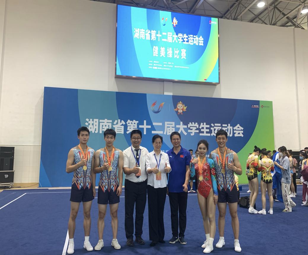我校健美操队在院领导、全体教师及教研室全方位的支持下,不负众望斩获5金,为我校在湖南省第十二届大学生运动会各项目中勇担先锋,打了精彩漂亮的一仗。健美操队优异成绩的取得凝结着教练员和同学们的辛勤汗水和付出,汇聚着全校师生的支持与鼓励。特别是在比赛期间,汤琪同学不慎受伤。强忍伤痛的她坚持比赛,仍旧拿下三块金牌!