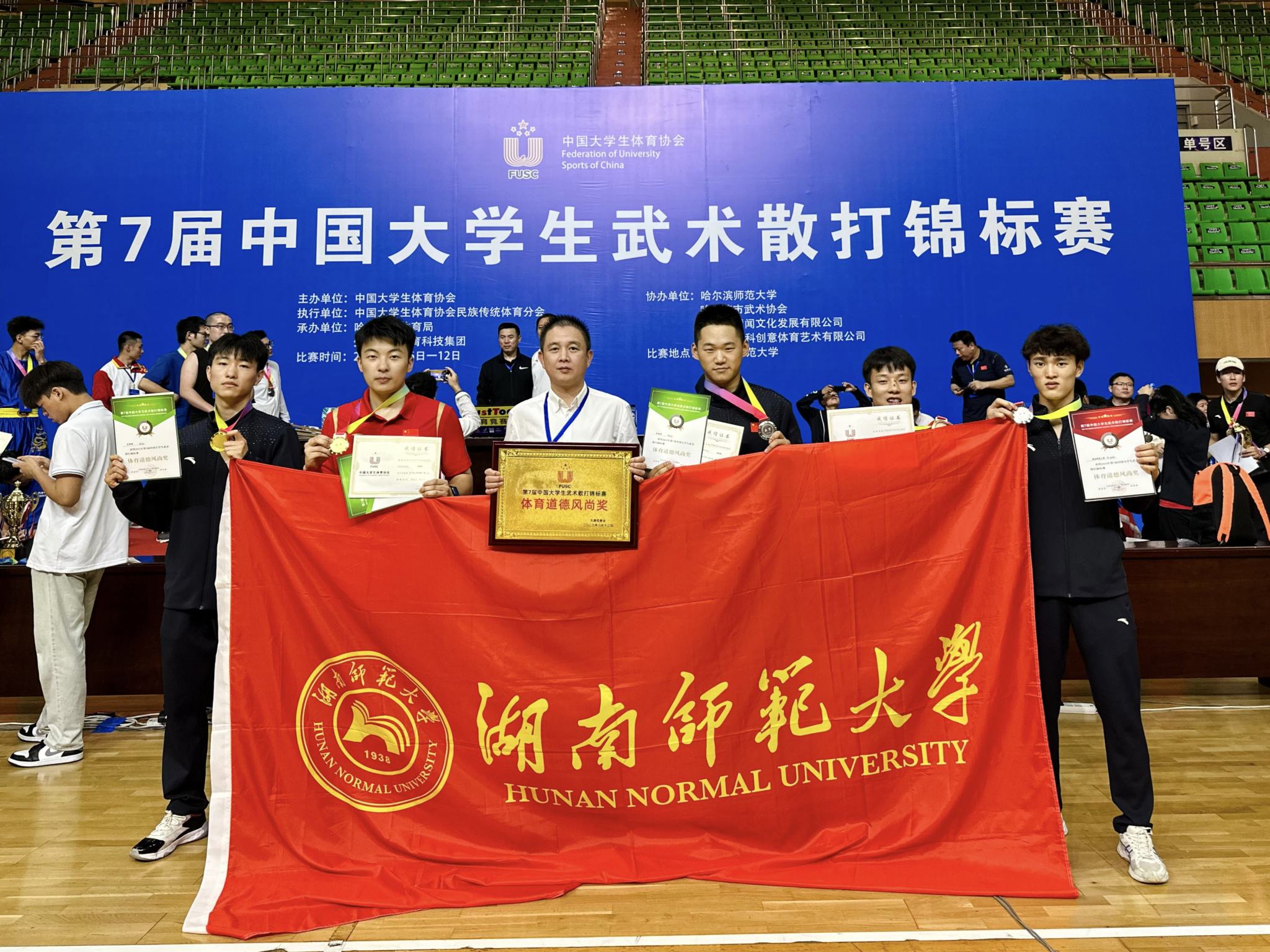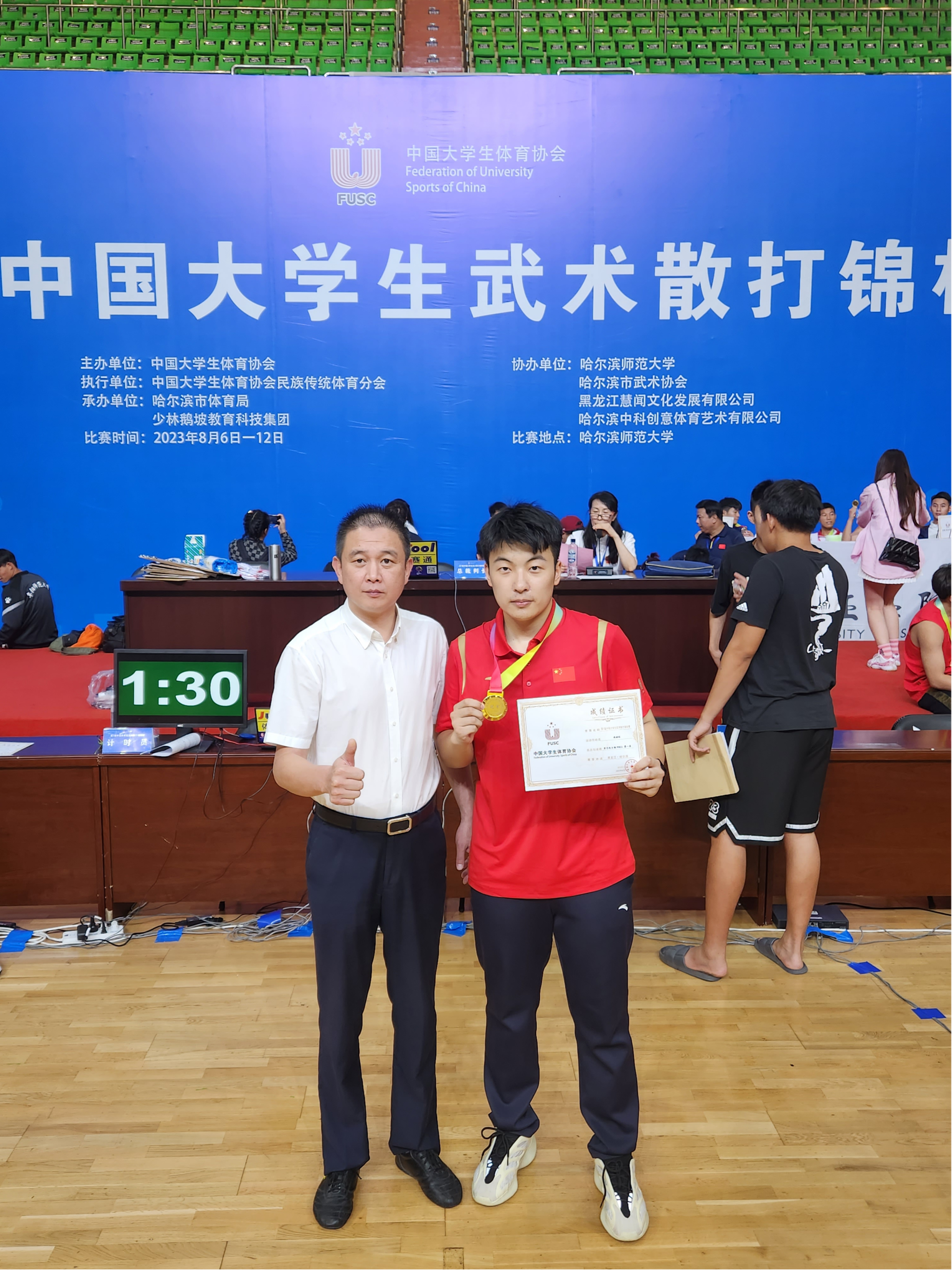 8月6日—12日,由中国大学生体育协会、哈尔滨市体育局主办,哈尔滨师范大学承办的第七届中国大学生武术散打锦标赛圆满落幕。太阳网集团tcy8722散打队派出5名运动员参加比赛,由我校体育学院党委书记李波和总教练郑波指导。经过五天的激烈角逐,最终斩获一金两银两铜,并获评“体育道德风尚奖”,郑波、陈志剑获“优秀教练员奖”,成涌旺,朱帅帅,程培桤获“优秀运动员奖”。