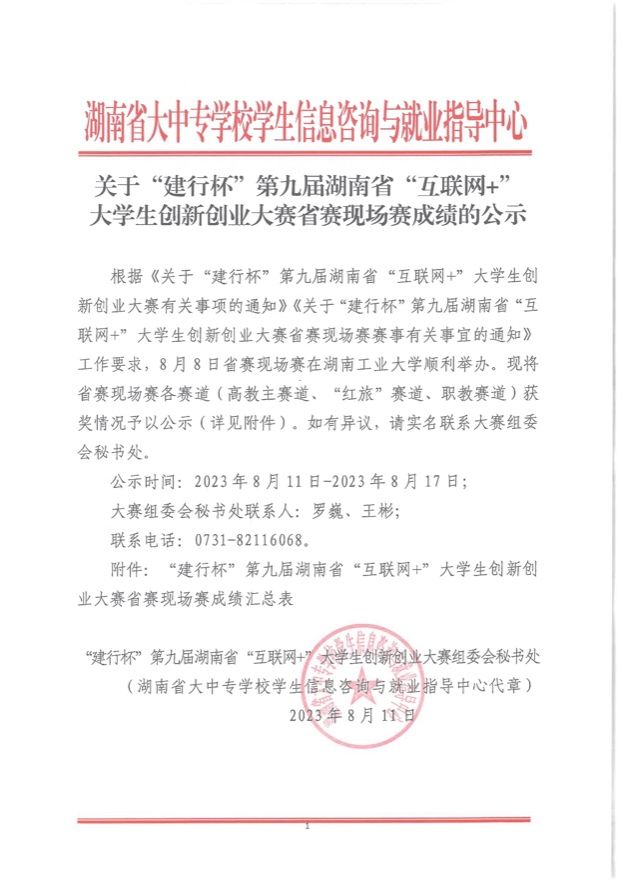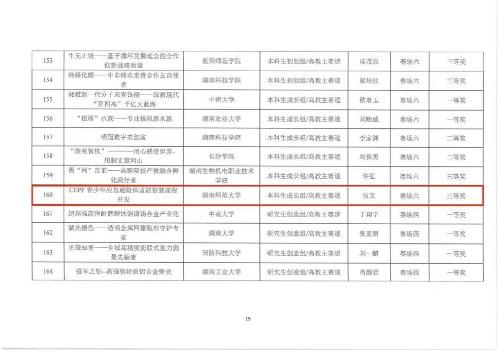 此外,湖南省教育厅发布了《关于“建行杯”第九届湖南省“互联网+”大学生创新创业大赛省赛现场赛成绩的公示》,我院由2019级体育教育(中外合作办学)专业伍艾等学生团队创作,夏禹、李皓两位老师指导的参赛项目《CEPF青少年应急避险体适能智慧课程开发》在大赛中荣获本科生成长组/高教主赛道湖南省三等奖,目前已推送参与国赛评选。