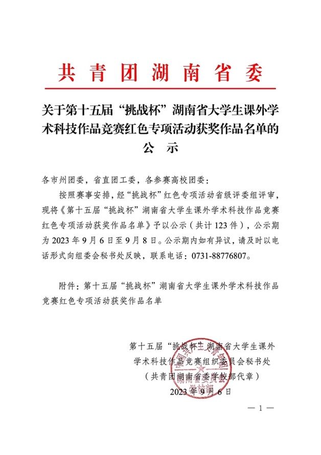 近日,由共青团湖南省委、湖南省教育厅、湖南省社会科学院、湖南省科学技术协会、湖南省学生联合会共同主办的第十五届“挑战杯”湖南省大学生课外学术科技作品竞赛红色专项活动获奖作品名单发布,我院由2021级武术与民族传统体育专业王馨晨等学生团队创作,郭恒涛、王静两位老师指导的参赛项目《以武铸魂青春当燃——探寻红色体育精神的时代传承》在大赛中荣获湖南省一等奖,取得学院该项赛事省赛零的突破,目前正在冲击国赛阶段。