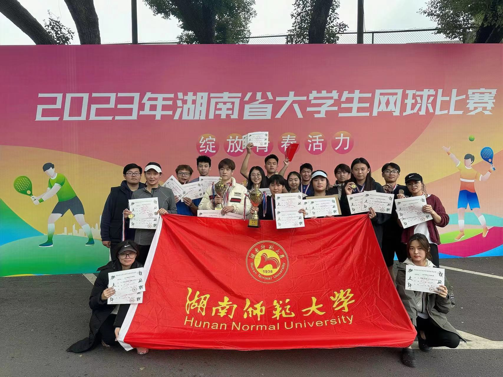 2023年11月23日,由湖南省学生教育厅举办的湖南省大学生网球比赛在湖南省网球管理中心顺利落下帷幕。在领队郭献中老师的带领下,在主教练袁征宇老师、黎明华老师的精心指导下,我校网球队一路砥砺前行、披荆斩棘、不畏困难,共取得了6金2银2铜和的好成绩!包揽了乙组男、女子团体、混合双打、男子双打以及甲组女子单打的冠军。