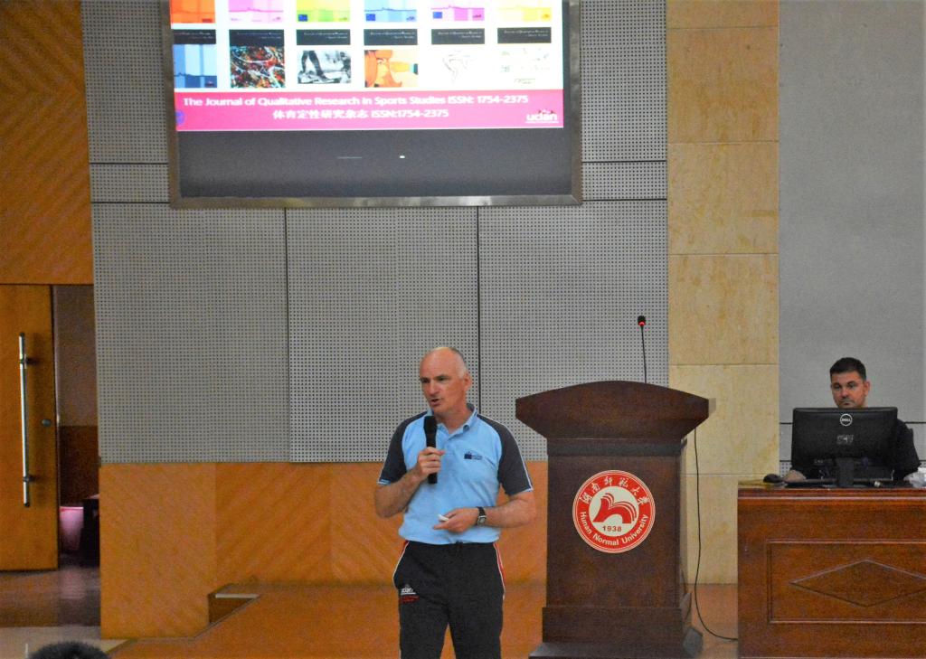 克莱夫•帕尔姆首先向大家介绍了他所主编的杂志《The Journal of Qualitative Research in Sports Studies》(《体育质性研究》),他真诚欢迎我院师生积极投稿。随后他分享了在体育领域开展质性研究的心得,他用“5C”概括体育质性研究的5要素,即自信心(confidence)、好奇心(curiosity)、创造力(creativity)、批判精神(critique)、沟通交流(communication)。他围绕这5要素做了进一步阐释:保守好奇心才能善于发现周遭生活世界的问题。以批判精神分析问题,研究问题,从而不断提升创造力,在此过程中要注重与合作者交流沟通,形成研究合力,这样的研究才可以不断增强自信心。