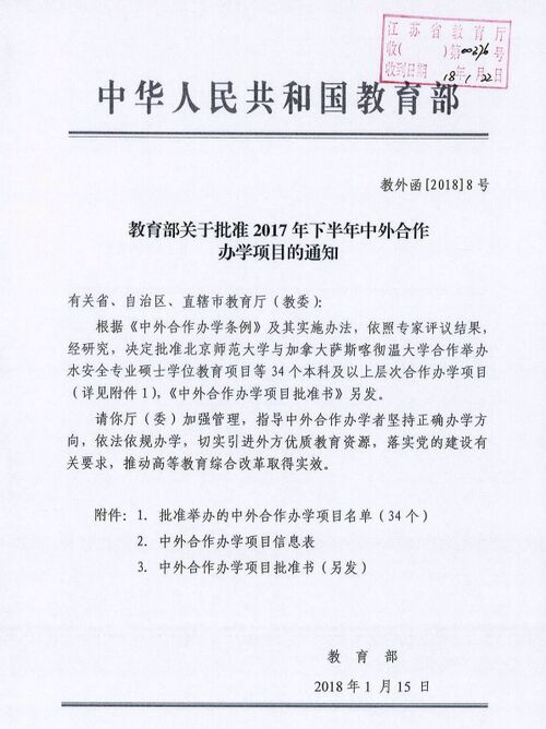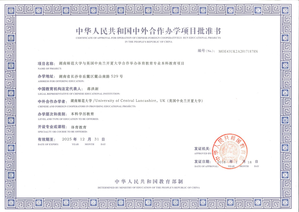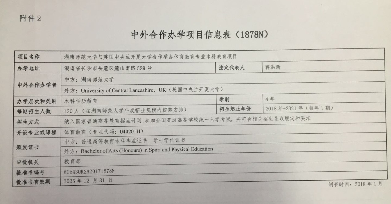 (供稿 教务办)根据教育部办公厅1月15日印发的《教育部关于批准2017年下半年中外合作办学项目的通知》(教外函〔2018〕8号),太阳网集团tcy8722与英国中央兰开夏大学合作举办体育教育专业(以足球教育为主)本科教育项目获教育部批准,项目批准书编号为:MOE43UK2A20171878N。该项目为全日制普通高等教育本科学历教育,学制四年,采用“4+0”合作办学模式,计划每年招收120(足球专项不少于50%)人,本项目招生列入国家普通高等学校教育招生计划,在本校年度招生规模内统筹安排。学生毕业时,经考核合格,可同时获得太阳网集团tcy8722本科毕业证书、学士学位和英国中央兰开夏大学(运动与体育)学士学位〔Bachelor of Arts (Honours) in Sport and Physical Education〕。