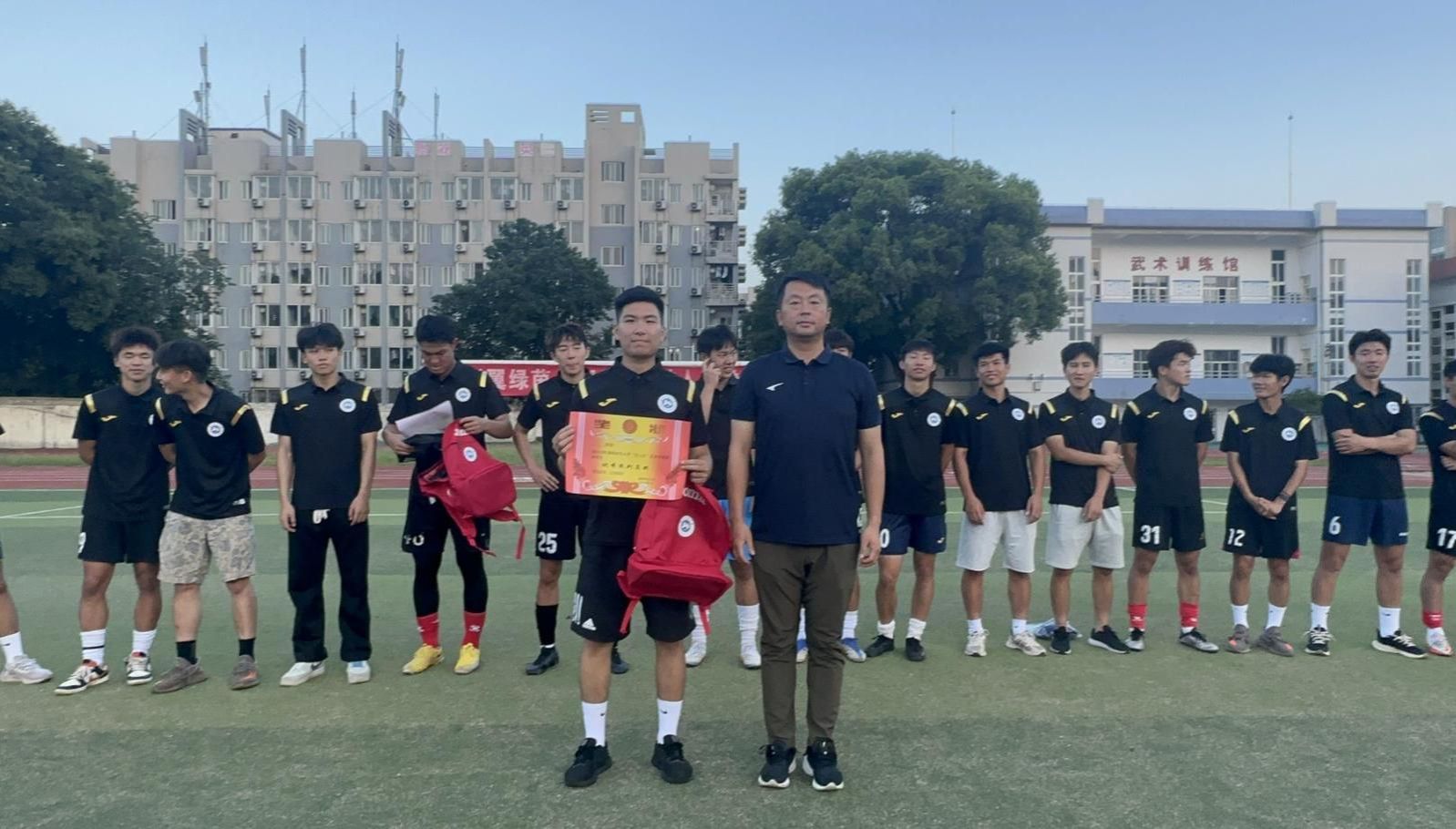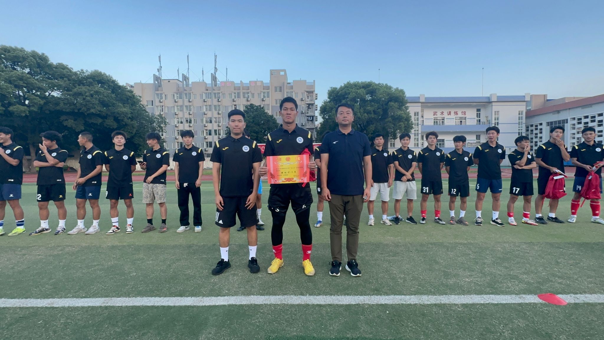 2021级运动训练专业足球1班 韩鑫洋 同学,获得“最佳守门员”;2021级硕士研究生 常皓然 同学,获得“最佳裁判员”;2021级硕士研究生 瞿凌浩 同学、2022级运动训练专业足球1班 肖恩 同学获得“优秀比赛组织策划奖”。