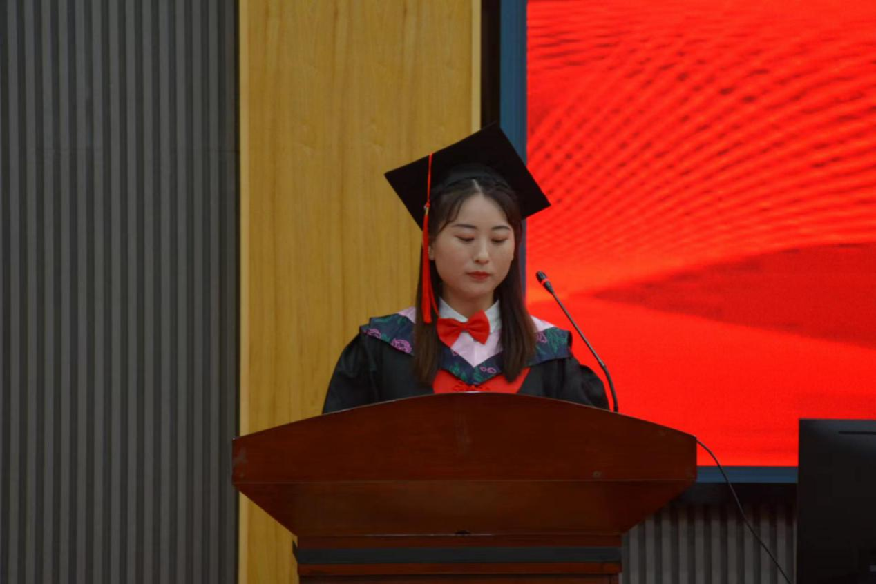 2020级博士研究生孙晨晨代表毕业研究生发言,首先她代表全体毕业生向母校、领导、老师及家长表示崇高的敬意和衷心的感谢,并表示“毕业并不意味着学术研究告一段落,而是以新的身份在新的起点上继续完成科研人的使命。”并祝愿体院滋兰树蕙,永续华章。