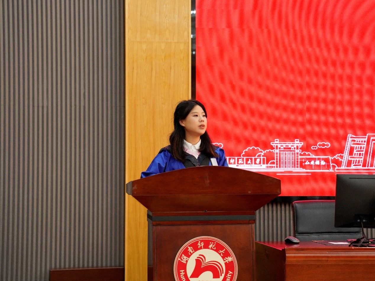 在读研究生代表范一凡发言,他向各位辛苦付出的老师们致以最崇高的敬意,并向即将毕业的学长学姐们献上最诚挚的祝福。他希望:在未来的日子里,学长学姐们能坚守初心、努力拼搏,在各自的岗位上发光发热,为祖国建设贡献自己的力量。