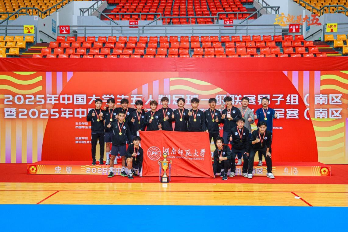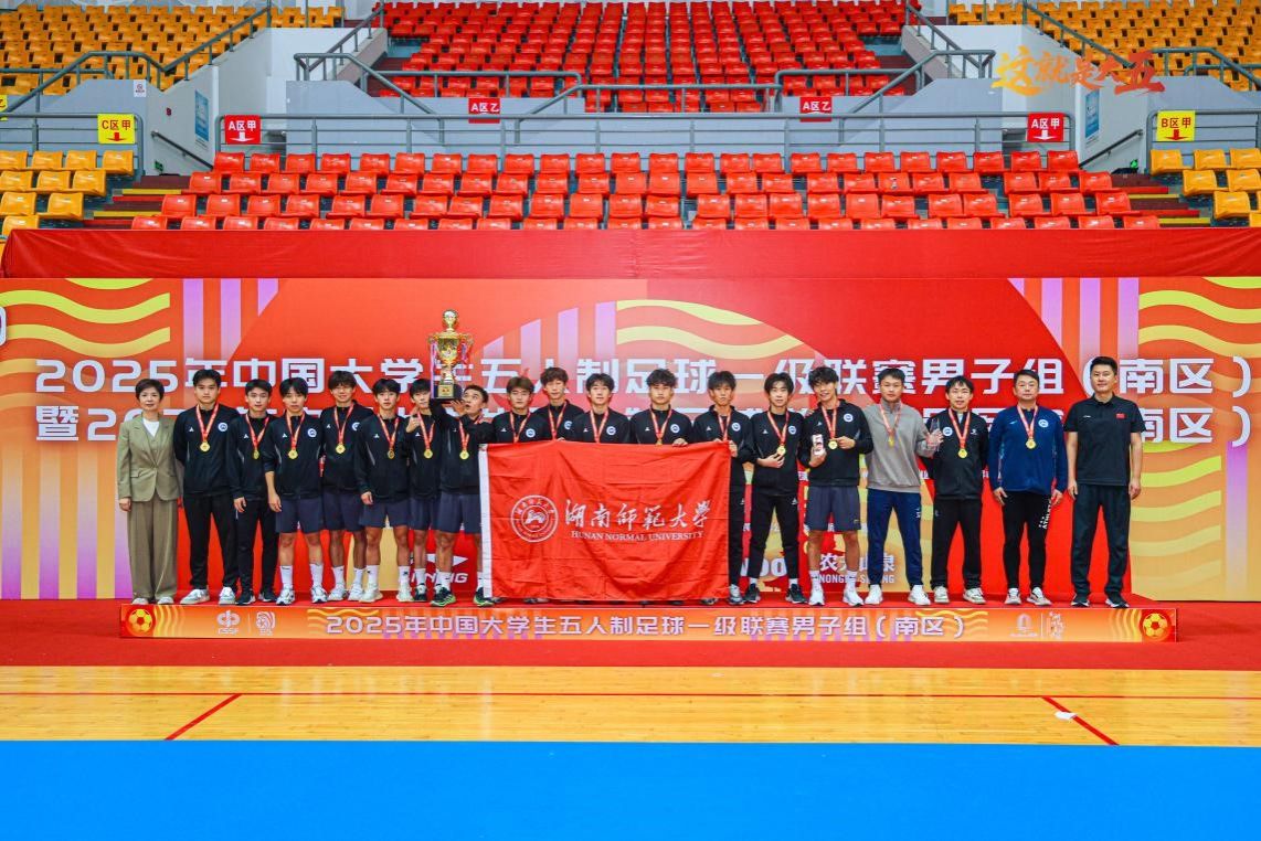 领队郭献中副院长时刻嘱托同学们要预防伤病、注意身体安全,主教练张宇在赛后采访中表示:“很遗憾在2024的比赛中我们只夺得亚军,但我们不忘初心,艰苦努力,在2025的比赛中实现了冠军的梦想!我们将继续代表湖南足球在全国大学生五人制足球总决赛上奋勇前行。”队长杨雨豪在接受采访中表示:“感谢同学们的付出,在没有五人制足球场训练的前提下,依然克服种种困难坚持科学训练,是我们取得好成绩的重要保证。”(如图四)