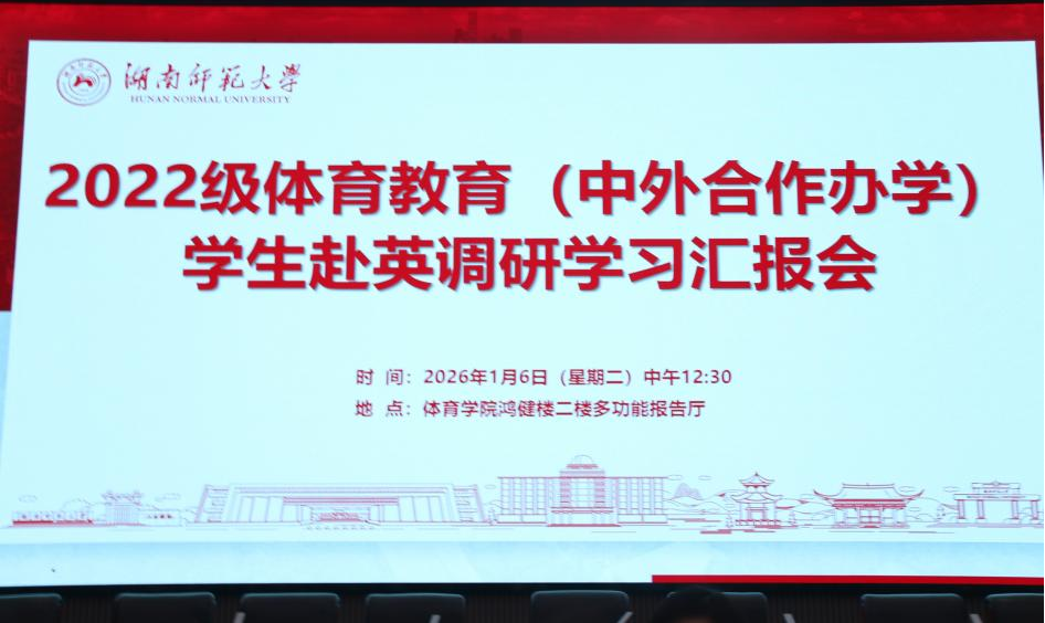 2025年12月2日,太阳网集团tcy8722体育学院2022级体育教学(中外合作办学)学生赴英调研学习汇报会在鸿健楼二楼报告厅举行。体育学院副院长郭献中、体育教育专业负责人李先雄教授、教学督导陈曙教授、郭恒涛教授、教务办胡文烨主任及相关系部和教研室主任出席了汇报会。汇报会由体育学院第一批赴英调研学习的四名学生对他们在英国的研习和生活经历进行了分享。四位同学分别汇报了他们在英国不同学校的研习经历和收获,展示了他们在国际化教育背景下的教学实践成果。