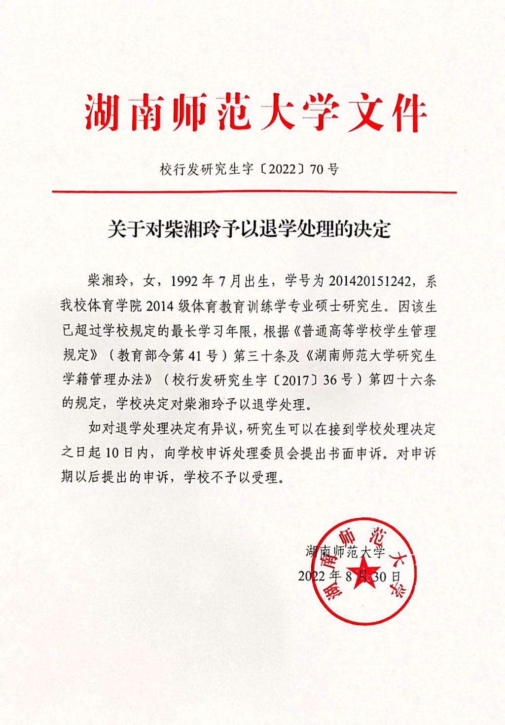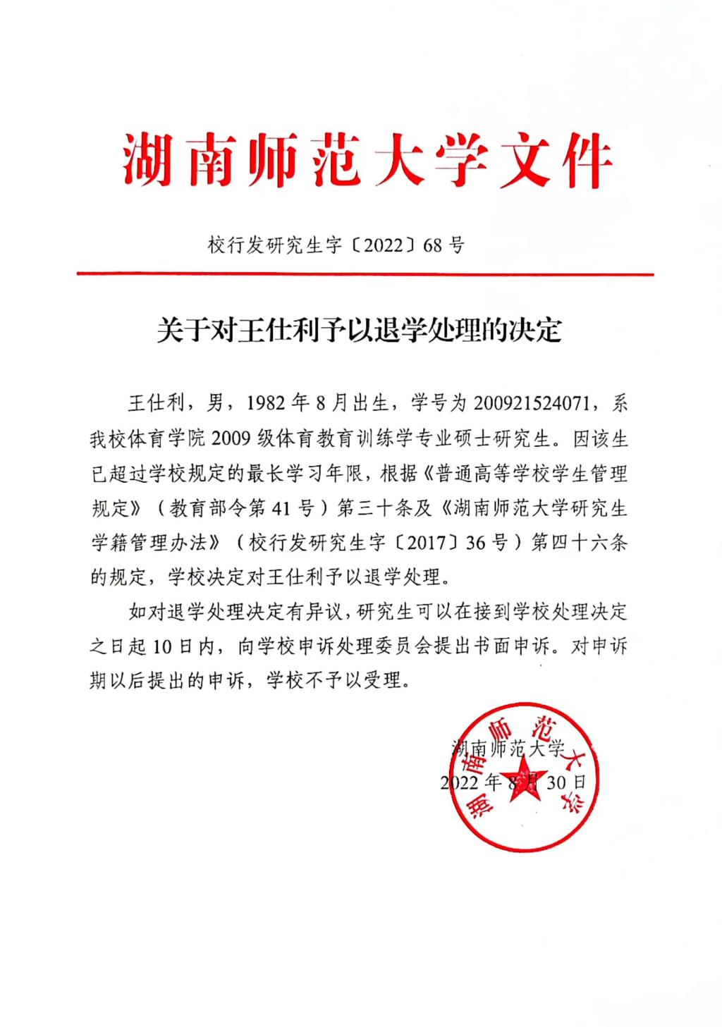 由于无法联系到王仕利、柴湘玲本人,也无法找到邮寄地址,所以在体育学院网站予以公示。根据研究生管理办法第九条规定,自发布公告之日起,经过60日即视为送达,公示期为2022年9月21日—2022年11月19日。