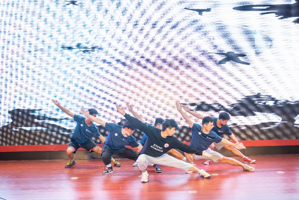 在汇报展演上,队员们表演武术。