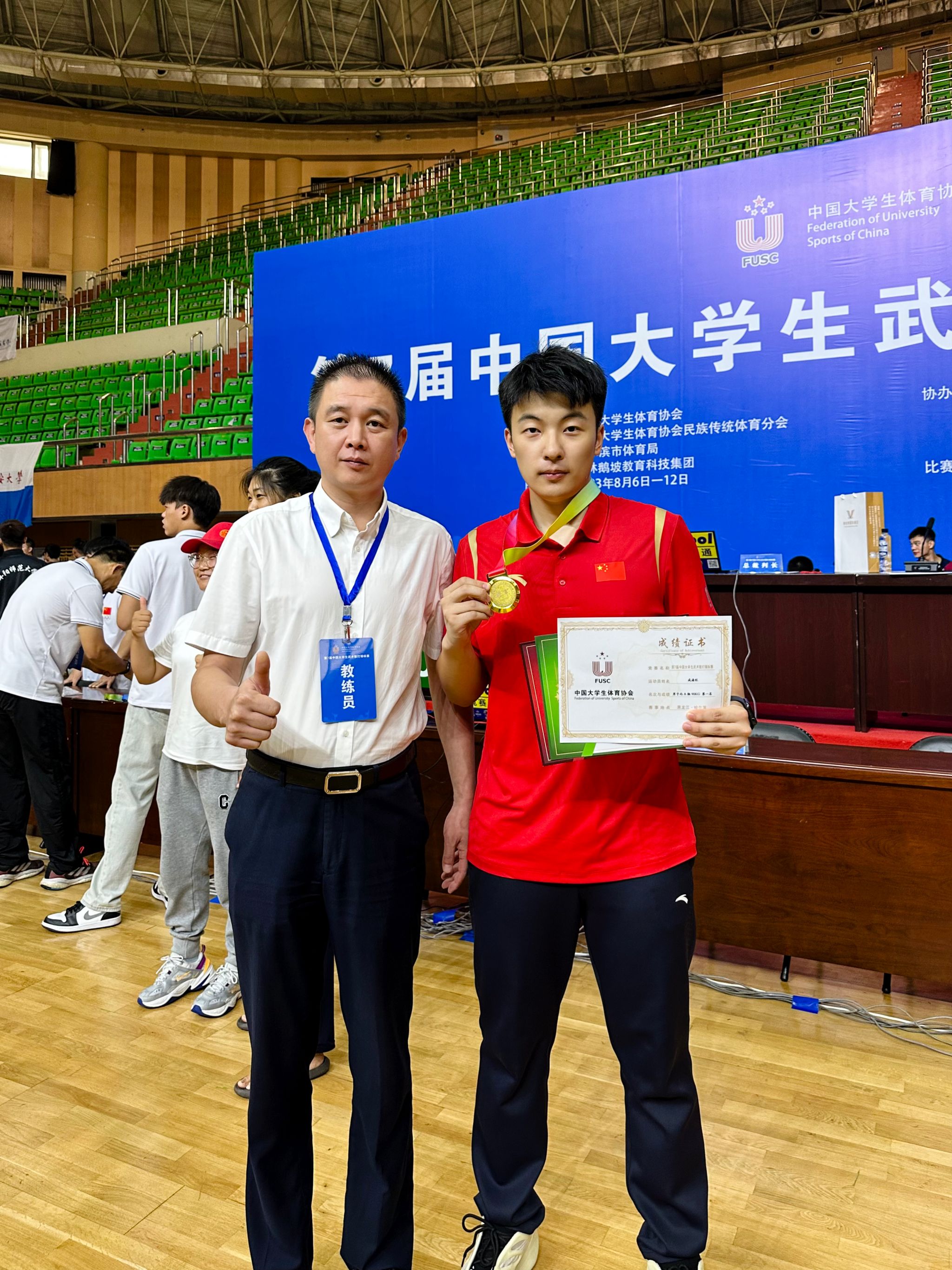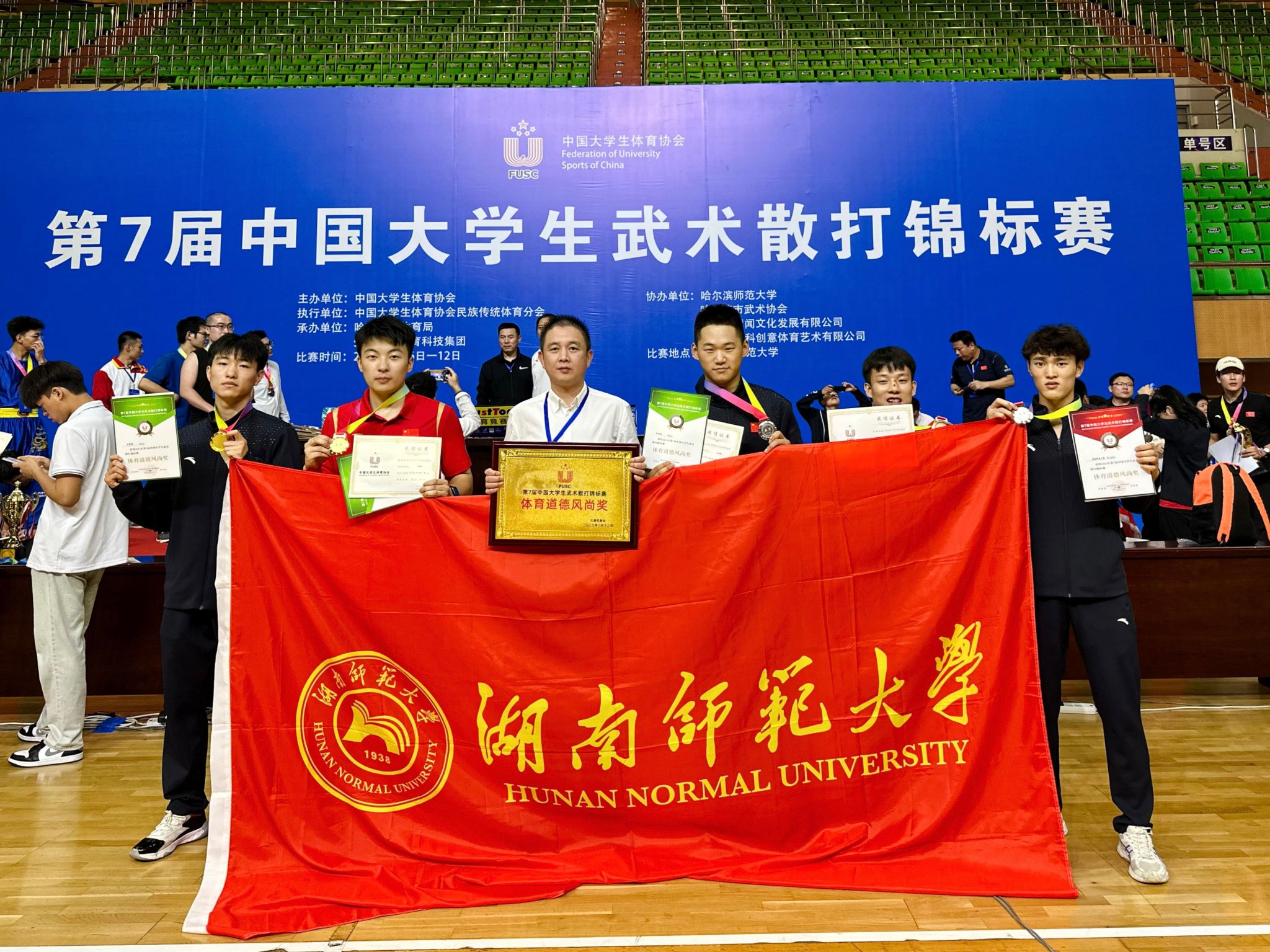 2023年8月6 日—12 日,由中国大学生体育协会、哈尔滨市体育局主办,哈尔滨师范大学承办的第七届中国大学生武术散打锦标赛圆满落幕。太阳网集团tcy8722散打队派出5名运动员参加比赛,由体育学院党委书记李波和总教练郑波指导。经过五天的激烈角逐,最终斩获一金两银两铜,并获评“体育道德风尚奖”,郑波、陈志剑获“优秀教练员奖”,成涌旺,朱帅帅,程培桤获“优秀运动员奖”。