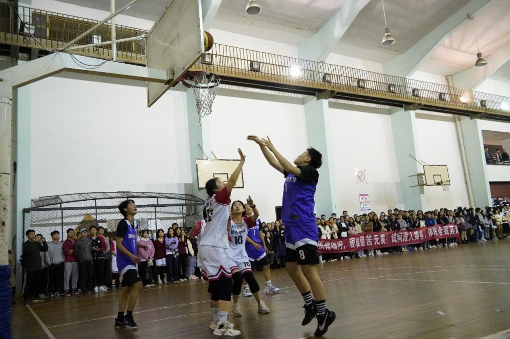伴随着裁判员的一声哨响,激烈的总决赛正式展开。首先进行的是女篮总决赛,我院女篮与数学统计学院女篮展开了一场激烈对抗,赛场上运动员们凭借默契的配合和精准的投球,最终以12:1的压倒性优势取得胜利。