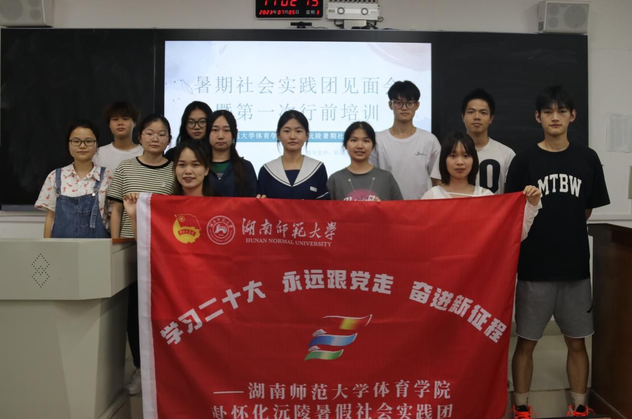 会后,团队成员与指导老师陈淦举队旗合影留念。据悉,体育学院赴沅陵暑期社会实践团全体成员参与此次培训会。