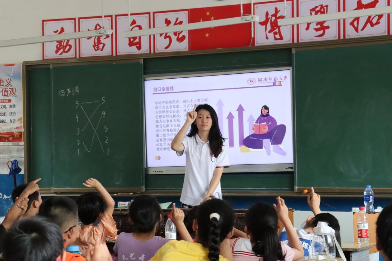 (通讯员 夏悦淇 蒋盼盼 张馨怡)7月6日,我校体育学院“致知力行”暑期实践团在湖南省邵阳县五峰铺镇为青云中学开展“学习语音发声 体会朗诵魅力”特色活动。将名家名篇带入课堂,通过教学发声技巧和朗诵感情,培养学生的听、说、读、写能力,增强学生的社会交际能力和语言表达能力,让学生在听觉上体会朗诵的情感澎湃,在内涵上领悟中华传统文化之美。