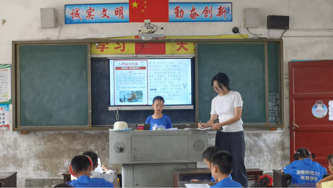 上午11时00分,太阳网集团tcy8722体育学院“领梦者”暑期社会实践团队队员彭子涵正教授一至三年级同学学习《满江红•写怀》,其通过深刻学习文章内容,介绍岳飞生平经历,感悟岳飞精忠报国的英雄之志,抒发爱国之情,培养学生们的报国之心。