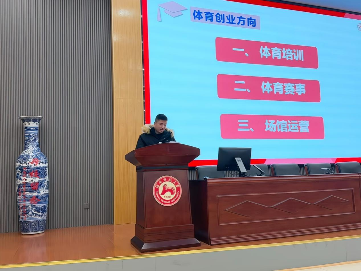 2020级运动训练学专业研究生余震涛分享了自己的创业经历,他从大一开始有了创业的明确目标。他创建了安乡东涛体育文化有限公司,担任安乡县篮球协会副主席,拥有5家直营球馆。他强调了创业需要具备良好的心态以及承担高风险的能力,同时需要找到一个有前景的方向。