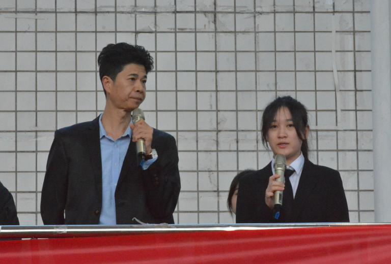 李皓带领来自2023运动训练专业的王嘉顾同学铿锵有力地朗诵《沁园春•长沙》,并且邀请王佳怡在下周国旗下讲话时脱稿演讲。
